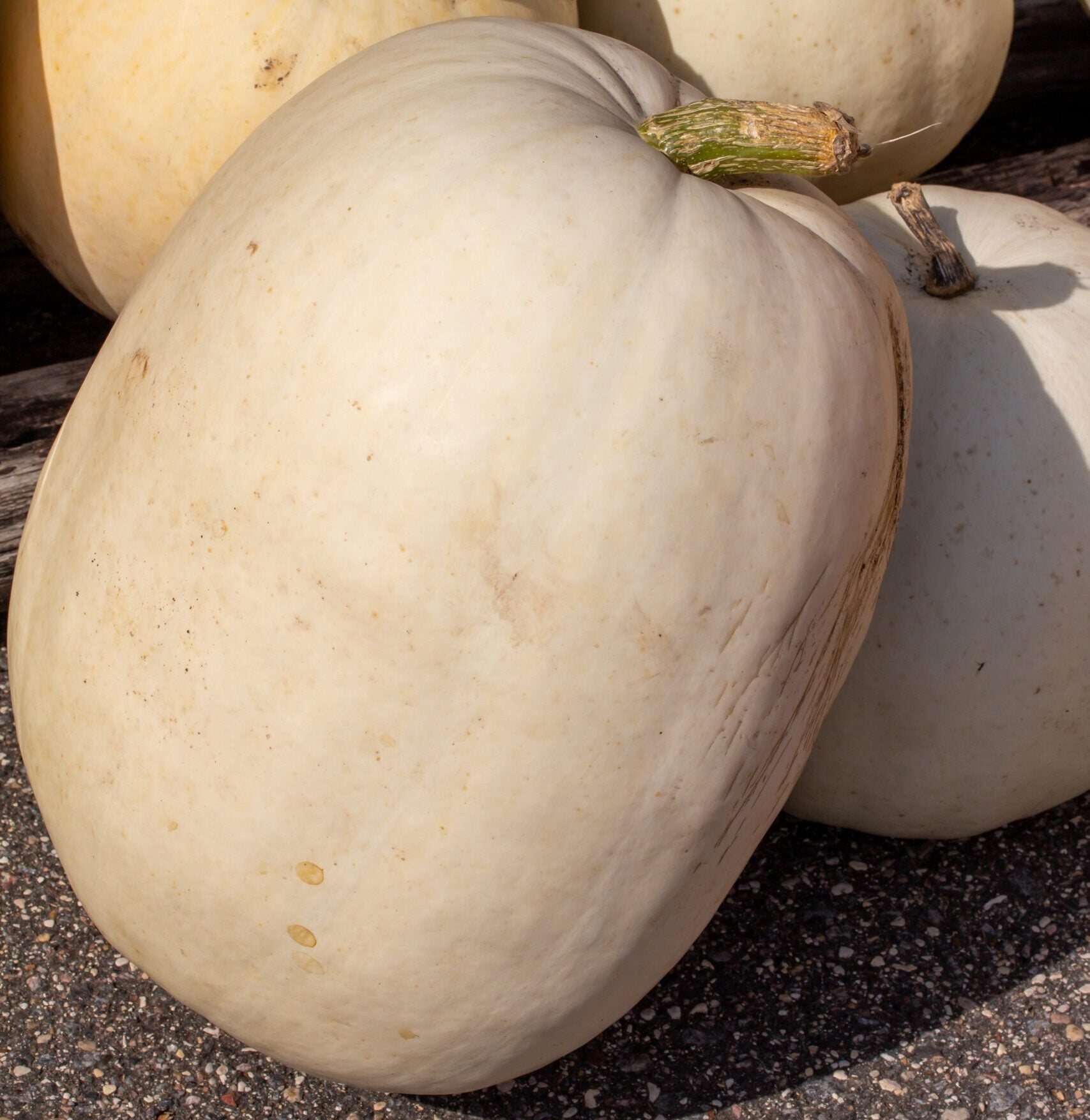 This variety is the giant of the white ones 30 pounds without care. Over 100 lbs with care like watering and weeding them when there young and some fertilizer at fruit set. This variety will need room to grow. Will take about 100 days but to all our northern gardening friends they start out white so if you get em late. Or have a early kill frost you still have Really cool pumpkins